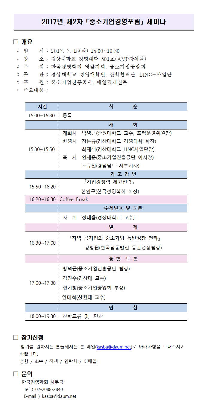 [한국경영학회] 2017년 제2차 중소기업경영포럼 (7/18(화) 개최)
