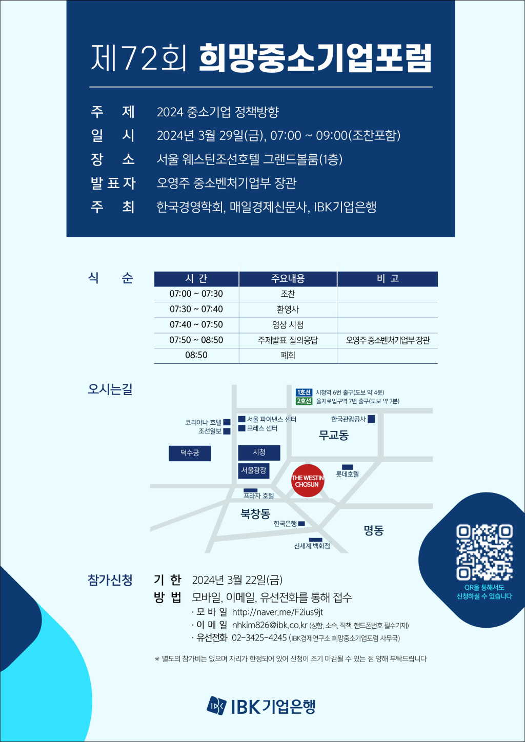 [한국경영학회][기업은행] 「제72회 희망중소기업포럼」 참가 신청 안내