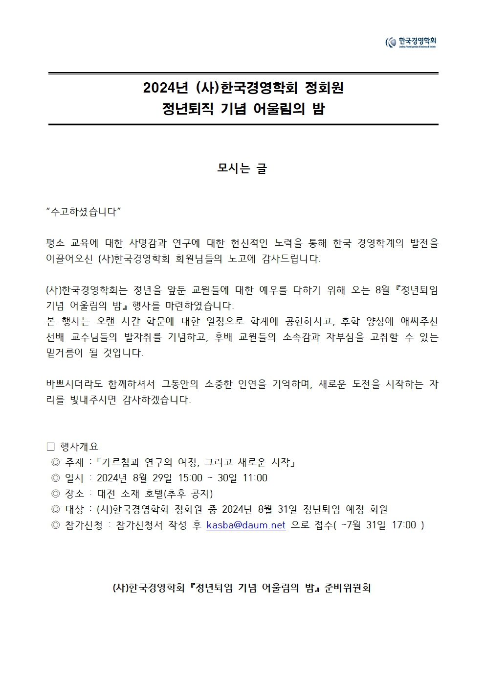 [한국경영학회] 2024 (사)한국경영학회 정회원 '정년퇴직 기념 어울림의 밤' 안내