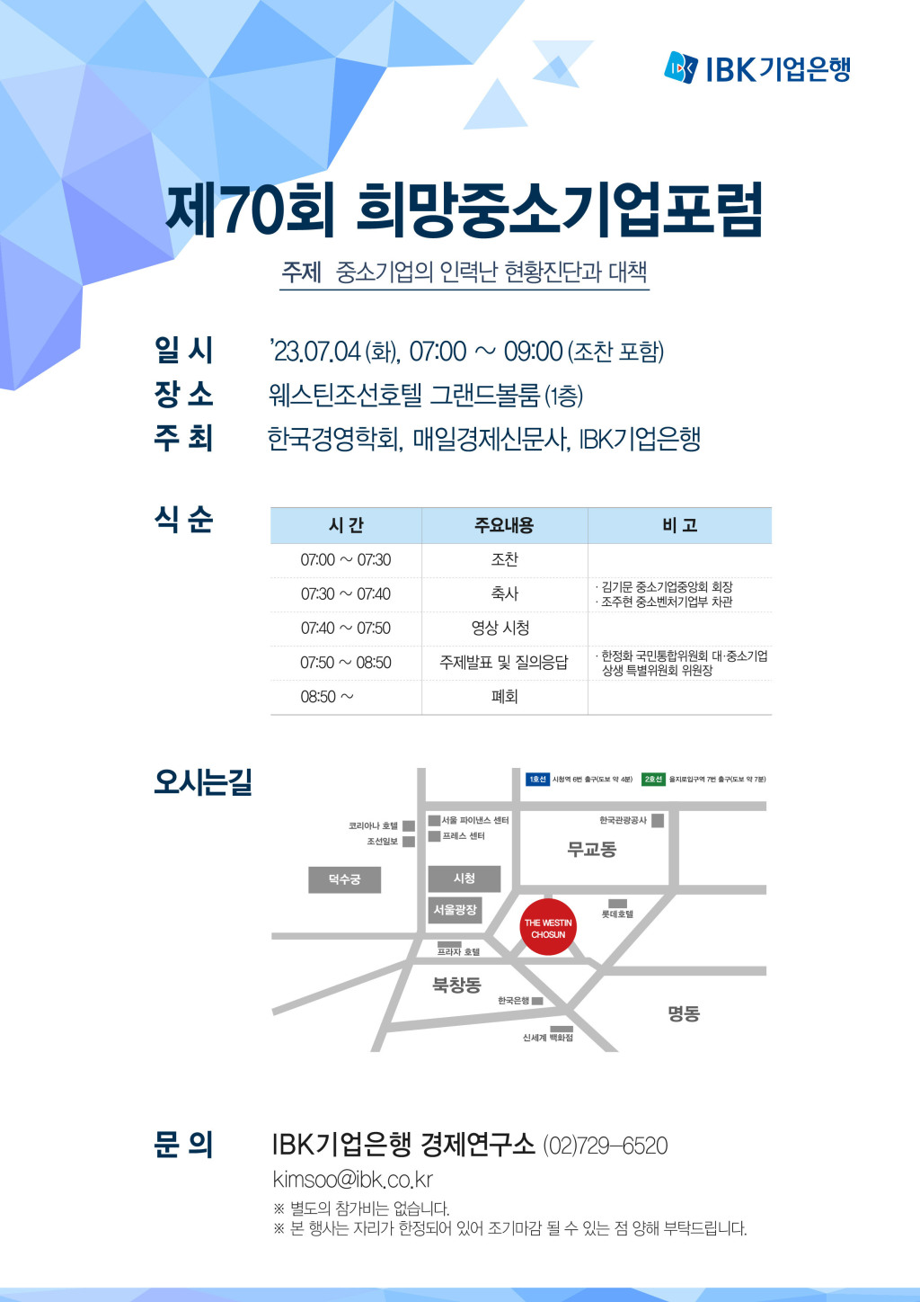 안녕하십니까? 한국경영학회 사무국입니다. 한국경영학회 · 기업은행 제70회 희망중소기업포럼이 아래와 같이 개최되오니 많은 참여 부탁드리겠습니다. ㆍ일시 : 7월 4일(화) 07:00~09:00 ㆍ장소 : 웨스틴조선호텔 그랜드볼룸 (1층) ㆍ참가신청 링크 : https://naver.me/FGe871Nx |