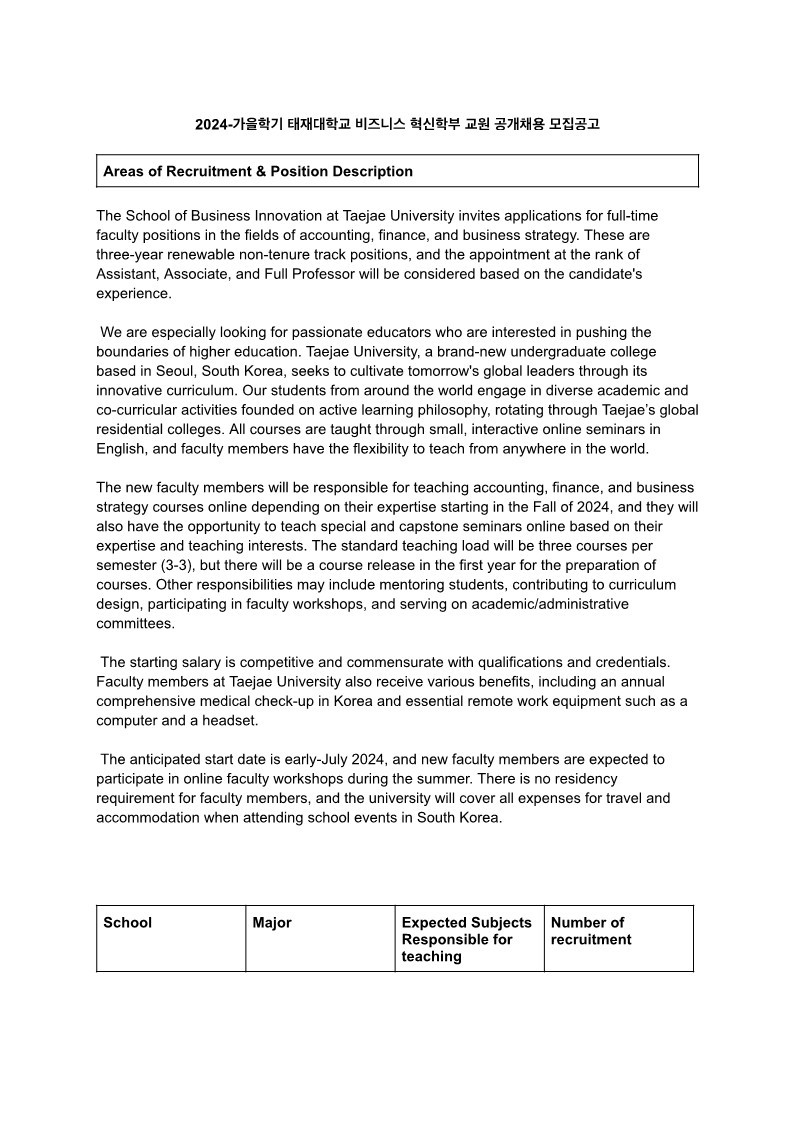 [태재대학교] 2024-가을학기 태재대학교 비즈니스 혁신학부 교원 공개채용 모집공고