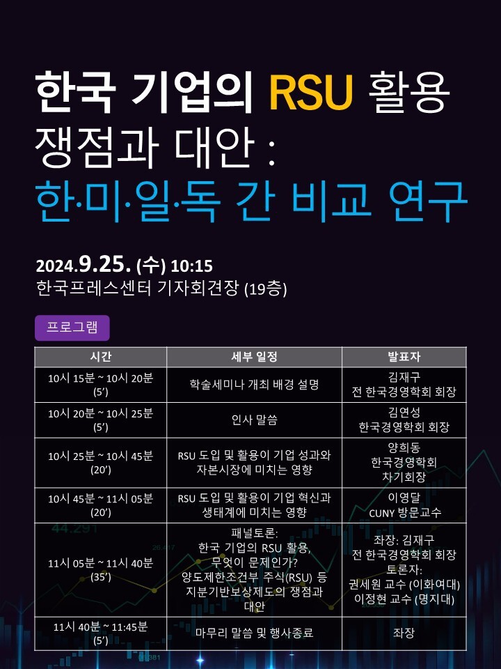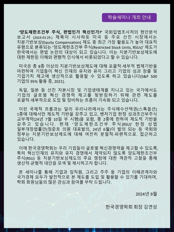 [한국경영학회] 한국 기업의 RSU 활용 쟁점과 대안: 한·미·일·독 간 비교 연구 학술세미나 안내 (9/25(수))
