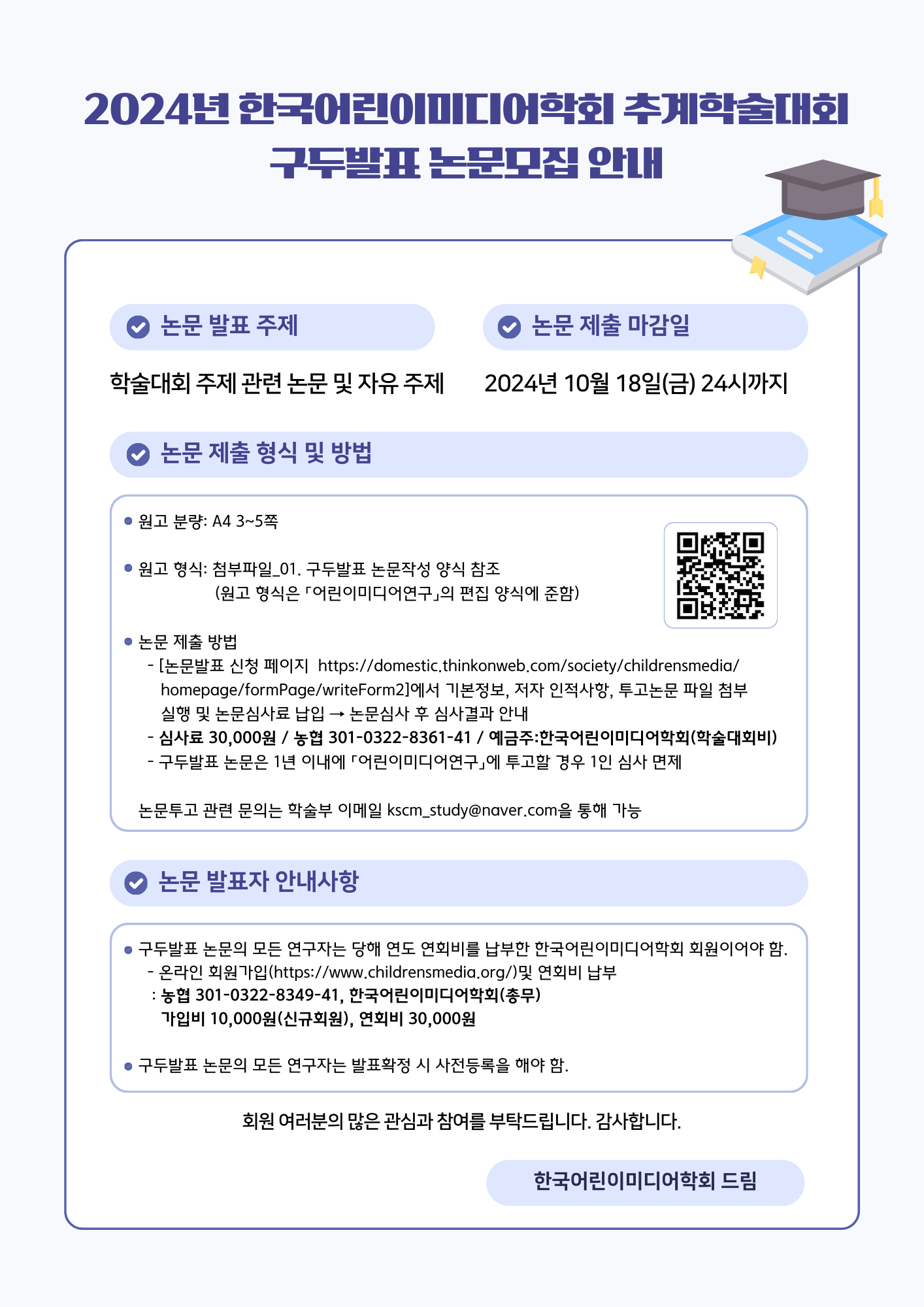 한국어린이미디어학회에 관심을 갖고 참여해주시는 회원님들께 깊이 감사드리며, 2024년 11월 16일(토)에 개최되는 추계학술대회 사전등록 및 구두발표 논문모집을 안내해 드립니다.