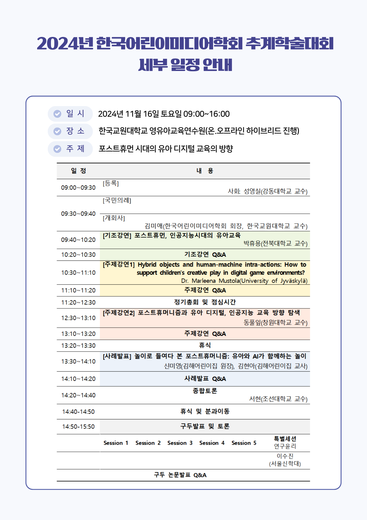 이번 추계학술대회는 ‘포스트휴먼 시대의 유아 디지털 교육의 방향’이라는 주제로 학계 및 현장 전문가를 모시고 학문적⸱실천적 배움과 공유의 즐거움을 나누는 장을 마련하고자 합니다.