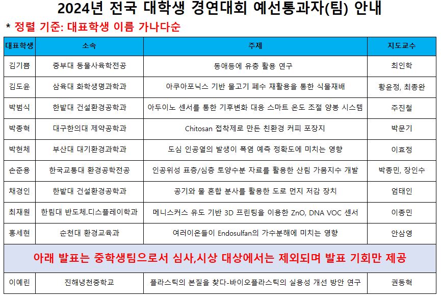 2024년 다양한 환경문제 개선을 위한 전국 대학생 경연대회 예선통과안내드립니다.