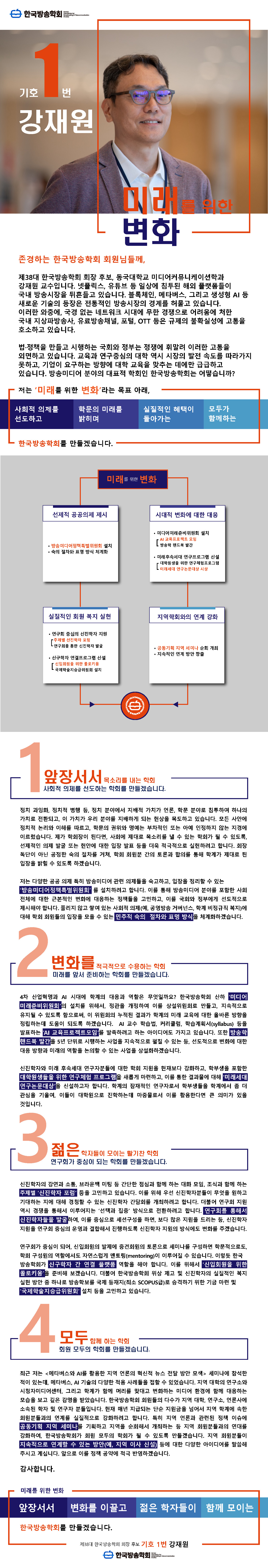 2. 한국방송학회는 2024년 11월 9일(토)에 실시될 제38대 한국방송학회 회장 선거 후보자의 2차 홍보물을 다음과 같이 안내합니다.