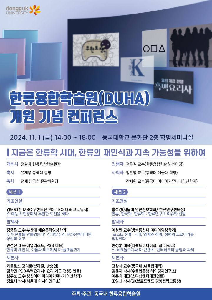 2. 동국대학교 한류융합학술원(DUHA)에서 개원 기념 컨퍼런스를 다음과 같이 개최합니다. 회원님들의 많은 관심과 참여 바랍니다.