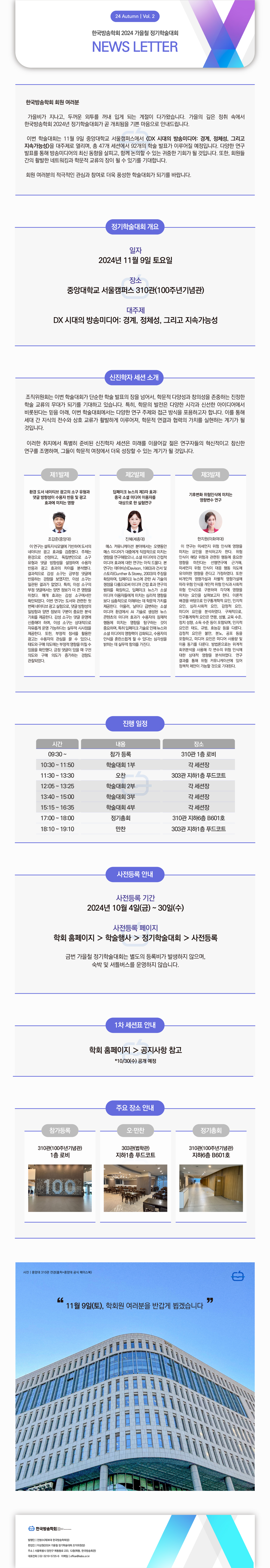2. 한국방송학회가 2024년 11월 9일(토) 중앙대학교 서울캠퍼스 310관(100주년기념관)에서 개최하는 2024 가을철 정기학술대회의 두 번째 뉴스레터를 다음과 같이 전해 드립니다. 회원 여러분의 많은 관심과 참여 부탁드립니다.