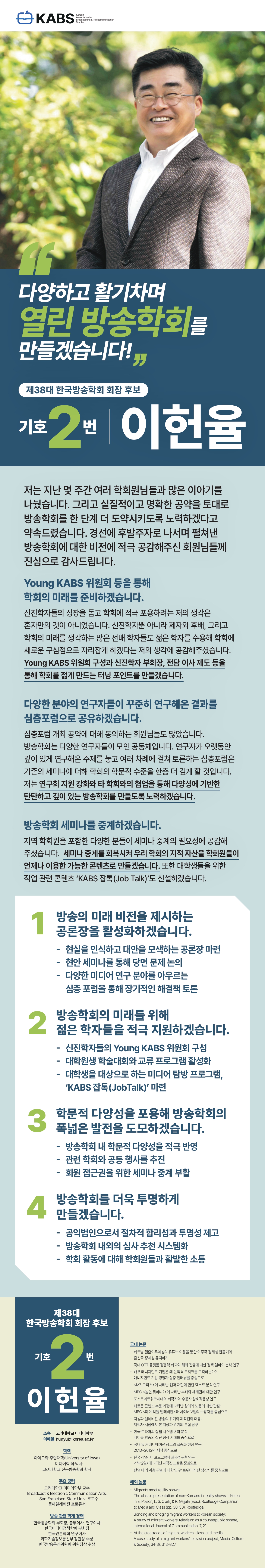 2. 한국방송학회는 2024년 11월 9일(토)에 실시될 제38대 한국방송학회 회장 선거 후보자의 3차 홍보물을 다음과 같이 안내합니다.