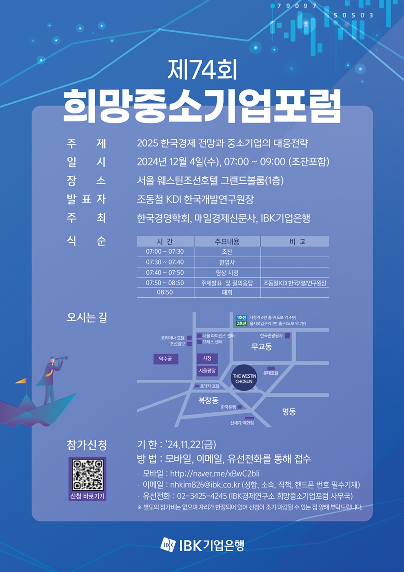 한국경영학회 · 기업은행 제74회 희망중소기업포럼이 아래와 같이 개최되오니 많은 참여 부탁드리겠습니다.