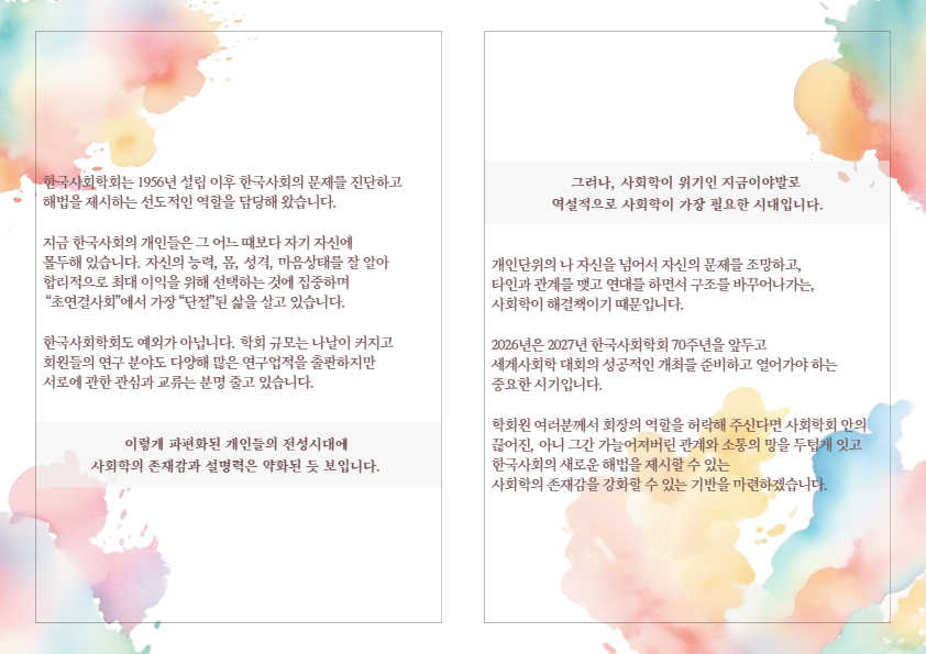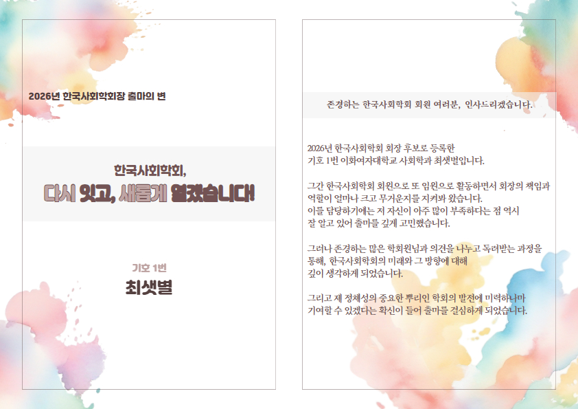 우리 학회 회원이자 학회장이신 최샛별 교수님이 차차기 한국사회학회장 선거에 출마하셨음을 알려드립니다.