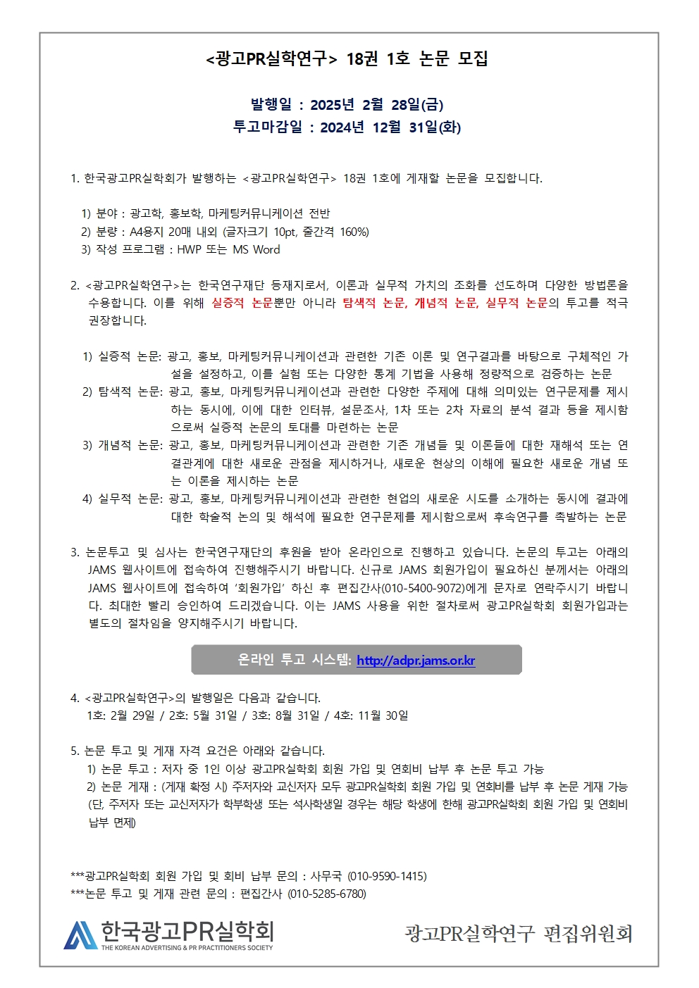 1. 회원님들의 건승을 기원합니다. 2. 한국광고PR실학회에서 <광고PR실학연구> 18권 1호 논문을 다음과 같이 모집합니다. 회원님들의 많은 관심과 참여 바랍니다.