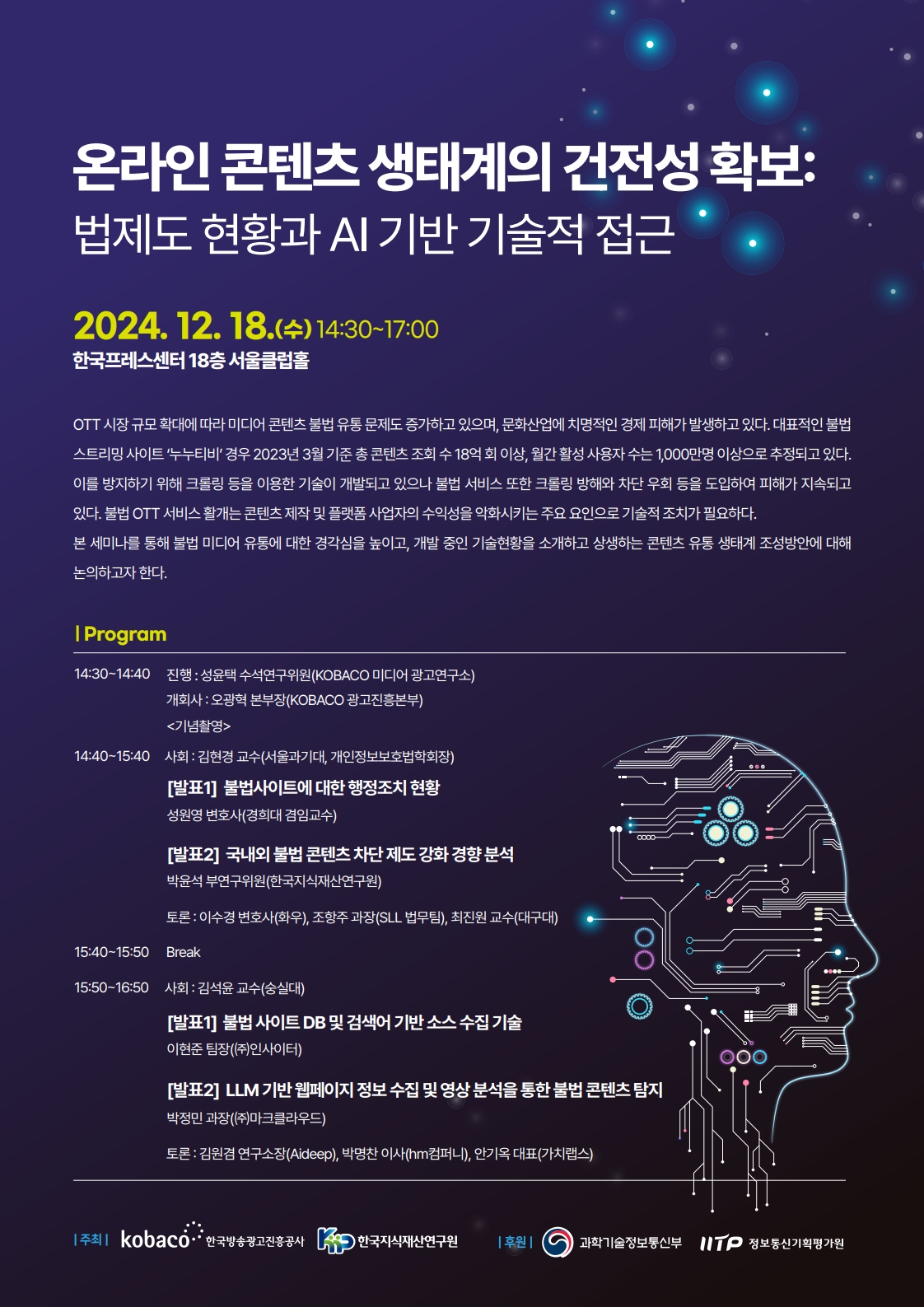 2. 한국방송광고진흥공사와 한국지식재산연구원에서 온라인 콘텐츠 생태계의 건정성 확보: 법제도 현황과 AI 기반 기술적 접근 세미나를 다음과 같이 개최합니다. 회원님들의 많은 관심 바랍니다.
