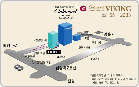 25기 신년 하례식은 삼성동 코엑스 옆의 Oakwood 호텔의 바이킹 뷔페에서 거행될 예정입니다. 최선 회장님이 심혈을 기울여서 장소를 잡으셨습니다. 그리고 일반 뷔페와 달리 시끄럽지 않고, 한식, 일식, 중식, 양식으로 제공되고 분위기도 좋다고 합니다. 자동차를 가지고 오시는 분은 주차시 꼭 주의하셔야 하는 것은