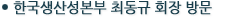 제 25대 사무국은 한국생산성본부 최동규 회장을 방문하고 2010년도 양 기관의 협력방안에 대하여 다양한 의견을 개진하였습니다. 사진의 가운데 최동규 회장을 중심으로 시계방향으로 최선 회장, 이의영 증경회장, 이창원 사무국장, 이춘선 부회장, 박광태 전회장, 이민호 사무차장, 박정수 사무차장이 참석하였습니다.