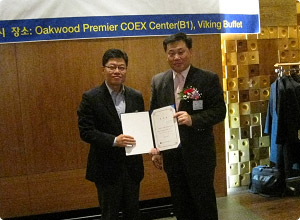 최동규 회장님의 축하와 동영상 시청 후 임원소개 및 위촉장 수여가 있었습니다. 먼저 차기회장으로 지명받은 서울대 이정동 교수에 대한 위촉장 수여와 더불어 위원회 대표로 편집위원장으로 위촉받은 경기대 신범철 교수가 위촉장을 수여 받았습니다.