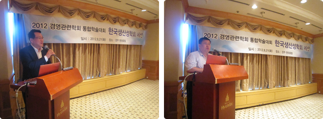 경영통합학술대회는 한국생산성학회의 회장이신 김재구 교수의 인사말과 차기 회장인 신범철 교수의 사회로 시작하였습니다. 경영학회의 사정상 늦은 저녁 5시 30분에 시작이 되었습니다.