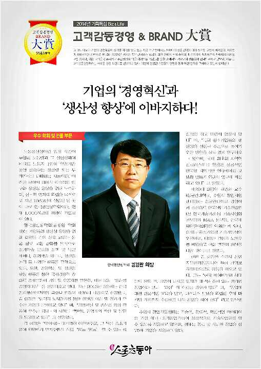 한국생산성학회(회장 김경환)가 스포츠동아의 고객감동경영 & BRAND 대상에서 ‘기업의 경영혁신과 생산성향상’에 이바지한 공로로 대상을 수상하였습니다. 회원여러분 관심과 애정의 결과라 생각됩니다. 감사합니다.