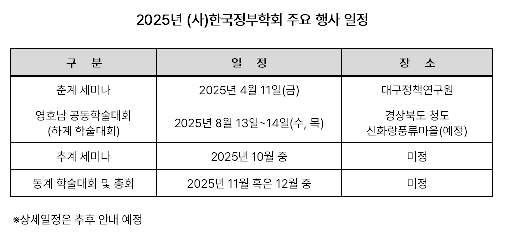 2025년도 (사)한국정부학회 주요 학술행사 일정을 안내드립니다.