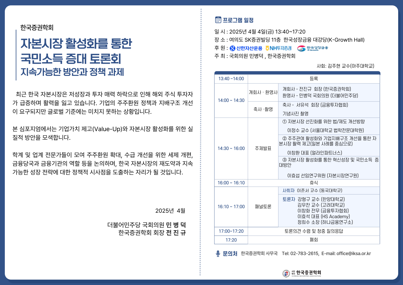 4월 4일(금) 민병덕 국회의원 - 한국증권학회『자본시장 활성화를 통한 국민소득 증대: 지속가능한 방안과 정책 과제』공동 정책 심포지엄 개최 안내