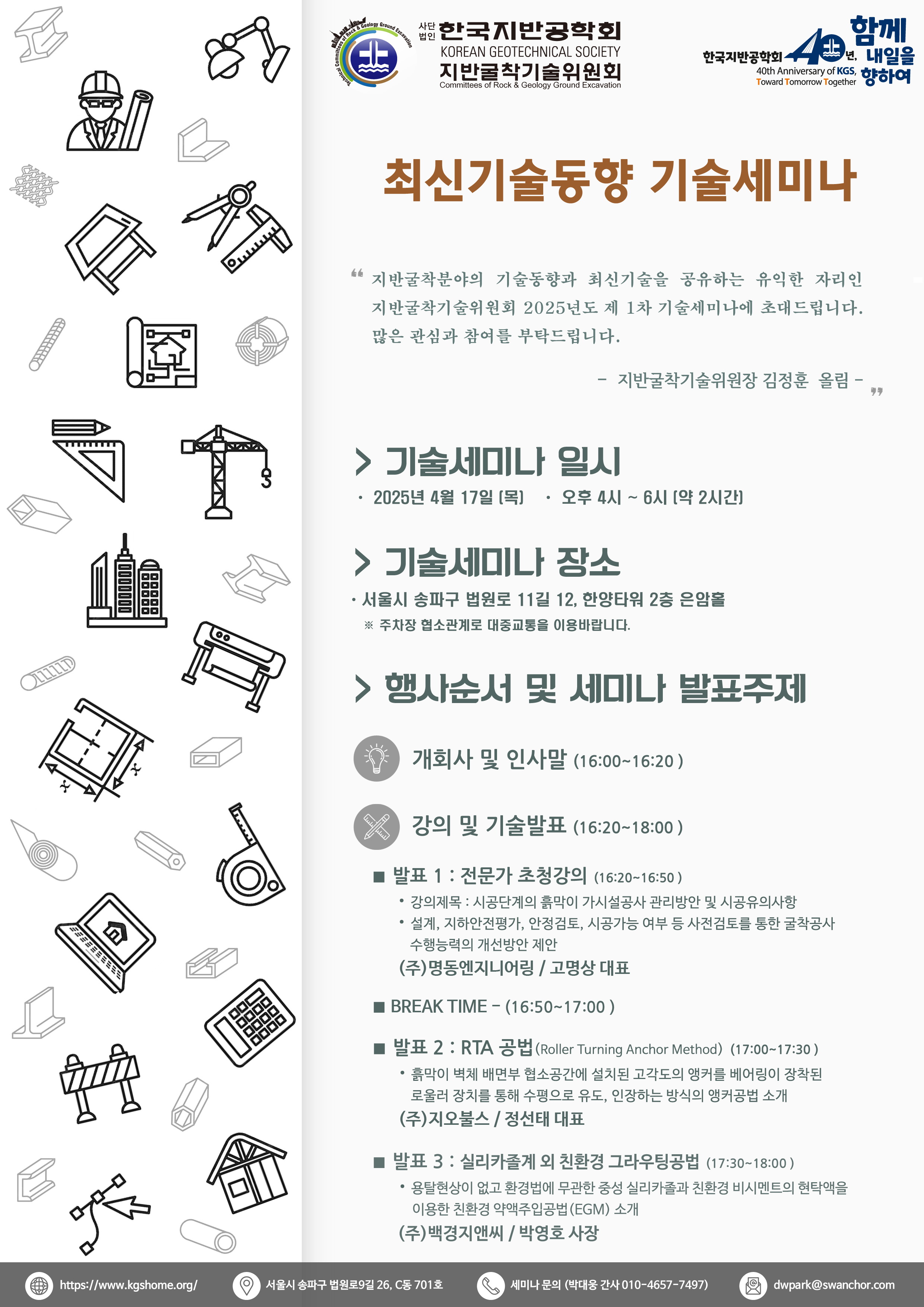 2025년도 지반굴착 기술위원회 1차 기술세미나를 다가오는 4월 17일 목요일에 진행하고자 합니다.