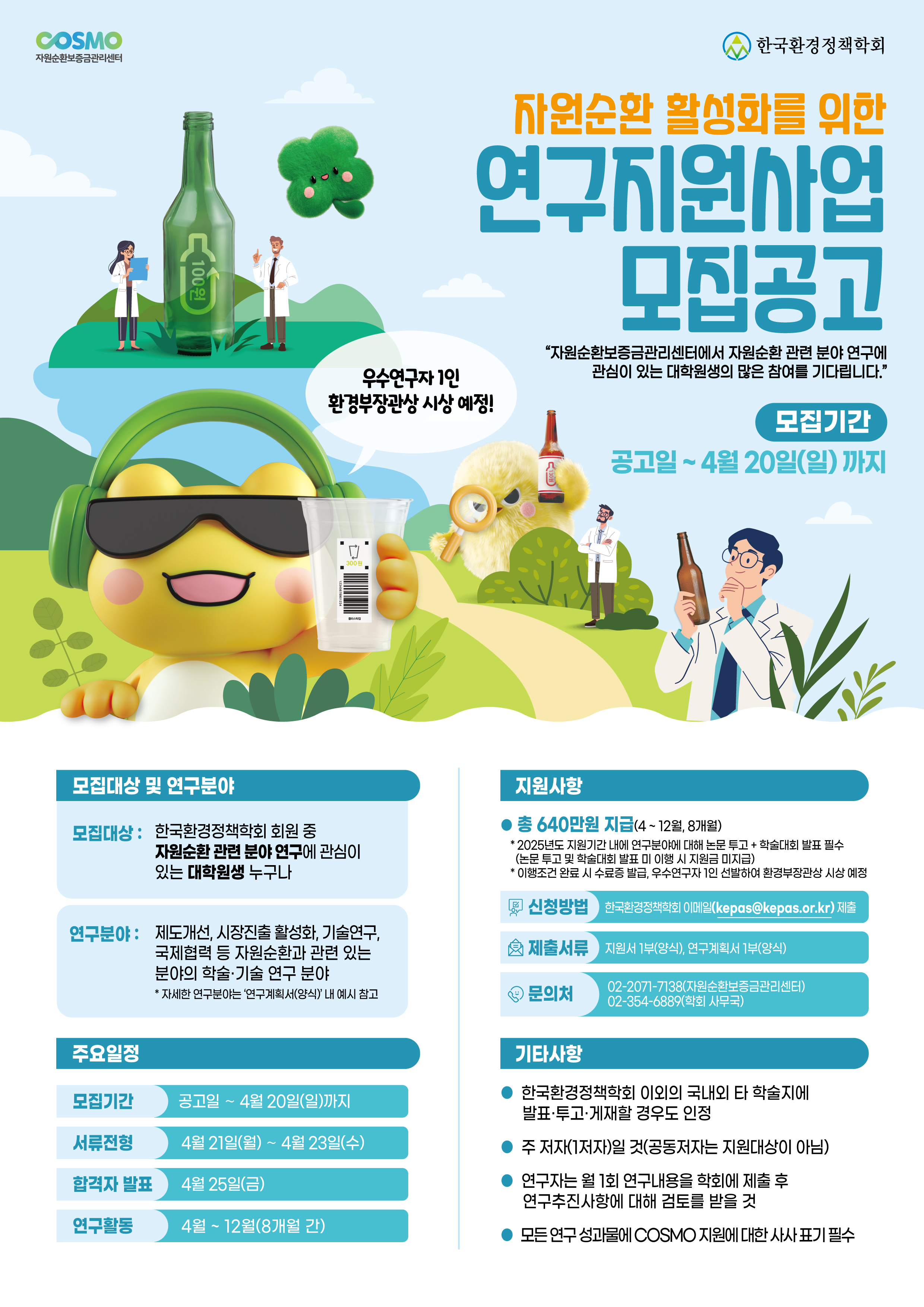 1) 목적 : ‘자원순환보증금관리센터 ’가 한국환경정책학회 회원 중 대학원생들에게 연구 장학금을 지원하여 자원순환 분야 인식 제고 및 발전 방안을 마련하기 위함.