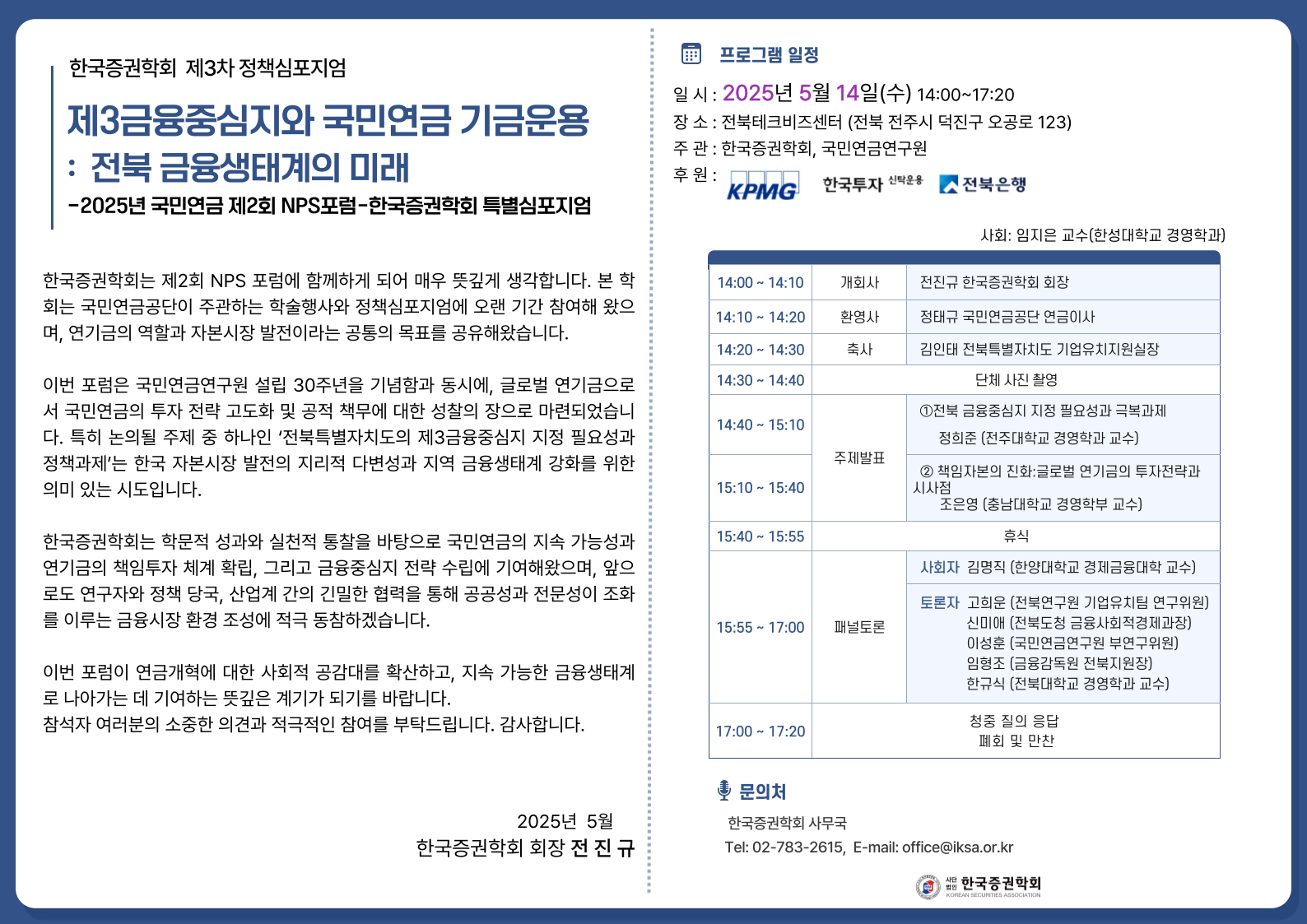 2025년 국민연금 제2회 NPS 포럼-한국증권학회 특별심포지엄「제3금융중심지와 국민연금 기금운용: 전북 금융생태계의 미래」개최 안내