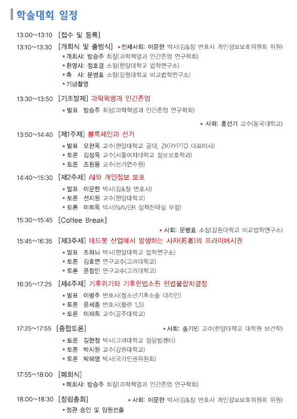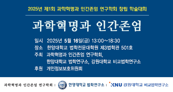 - 주최 : 과학혁명과 인간존엄 연구학회, 한양대학교 법학연구소 , 강원대학교 비교법학연구소