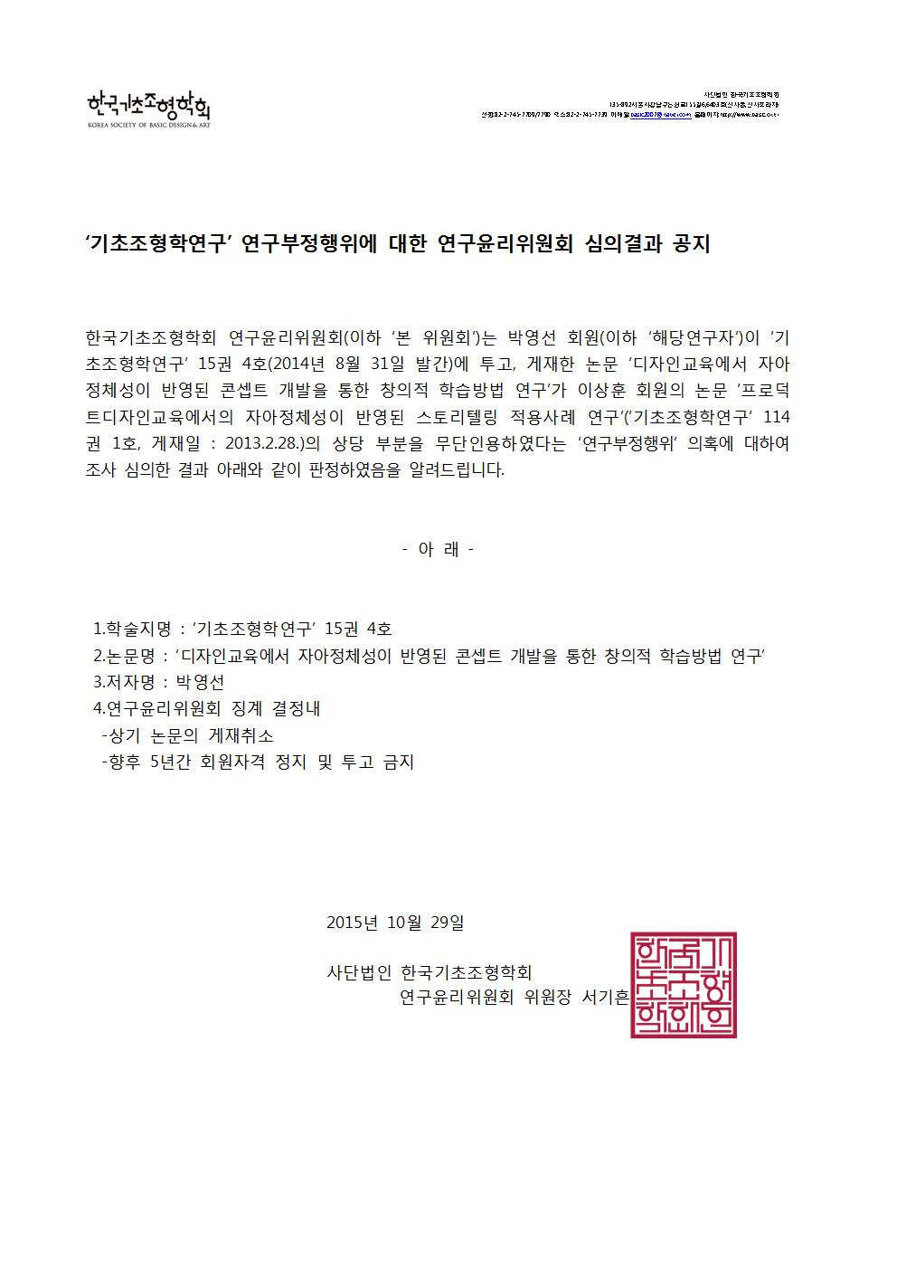 '기초조형학연구' 연구부정행위에 대한 연구윤리위원회 심의결과 공지