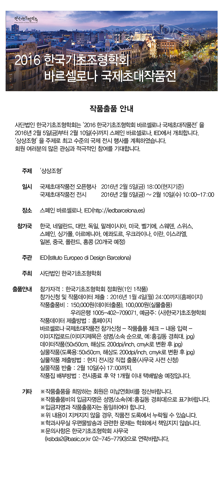 2016 한국기초조형학회 바르셀로나 국제초대작품전 현지참가자 모집 안내