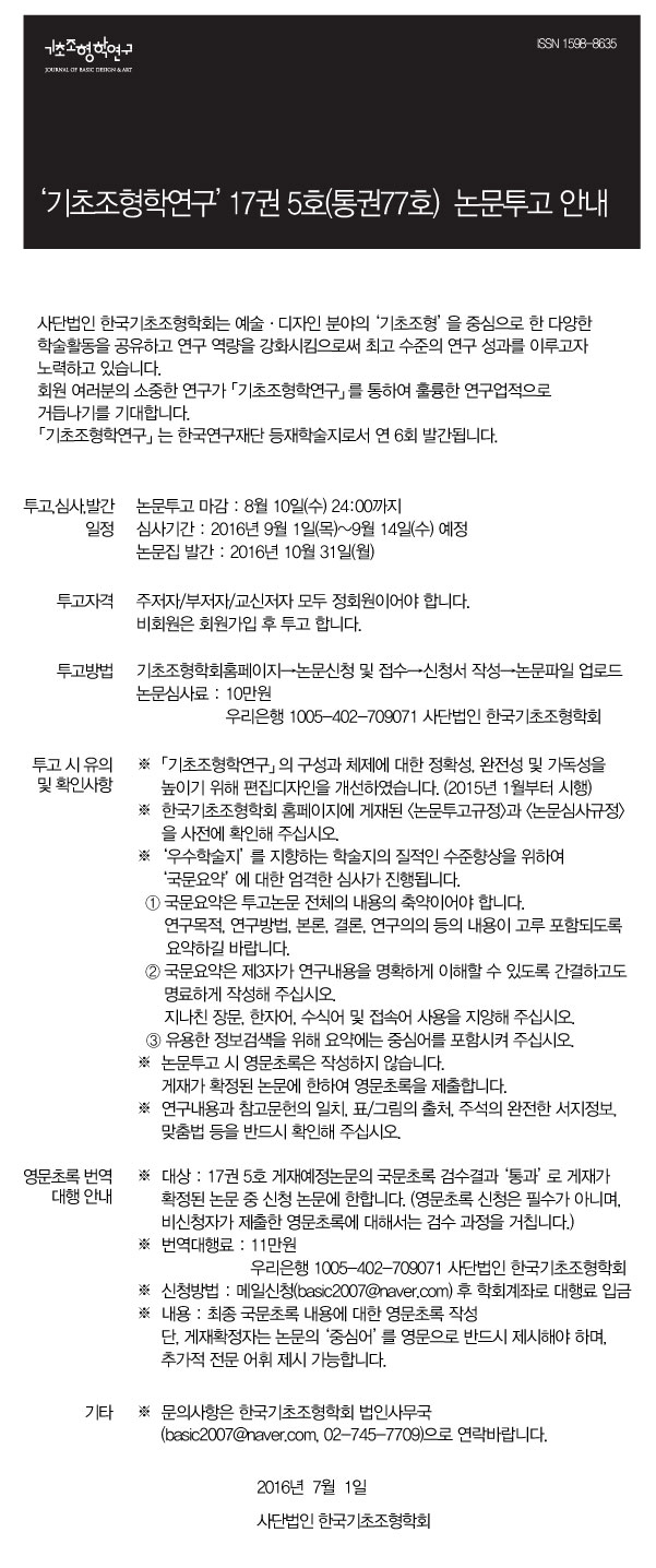 KSBDA '기초조형학연구' 17권 5호 (통권77호) 논문투고 안내