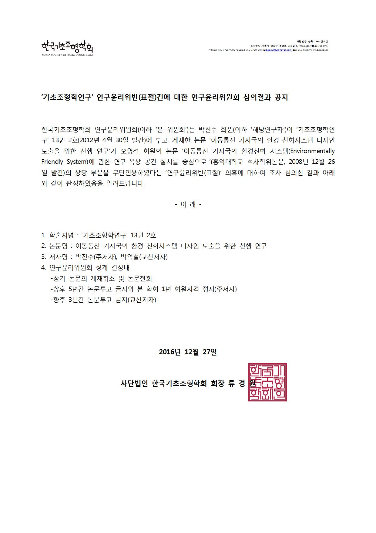 '기초조형학연구' 연구윤리위반(표절)건에 대한 연구윤리위원회 심의결과 공지