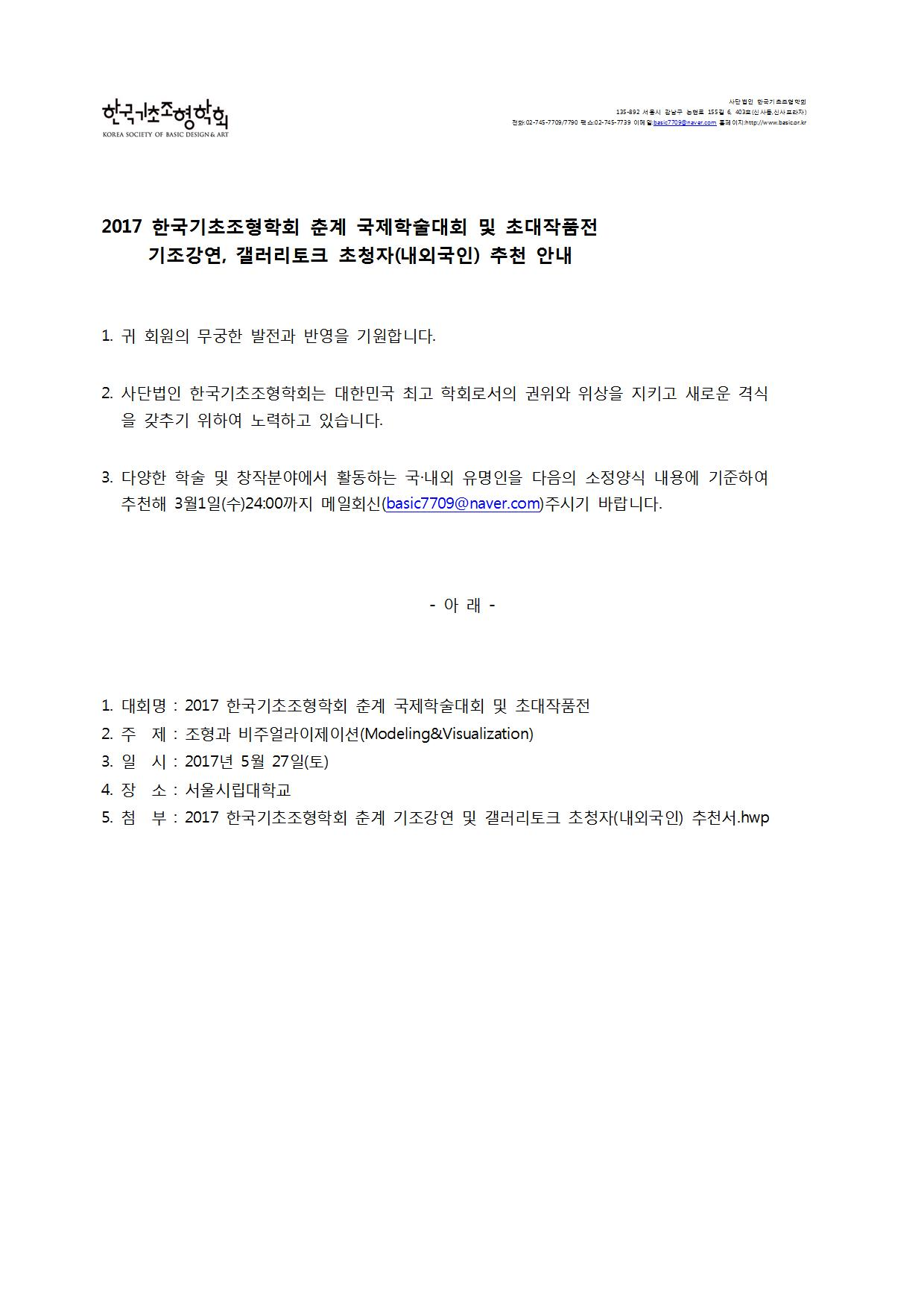 2017 한국기초조형학회 서울국제기획 초대개인전 개최에 따른 외국작가 추천의뢰 안내