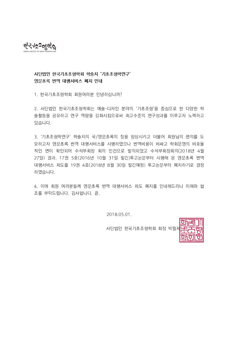'기초조형학연구' 영문초록 번역 대행서비스 폐지 안내