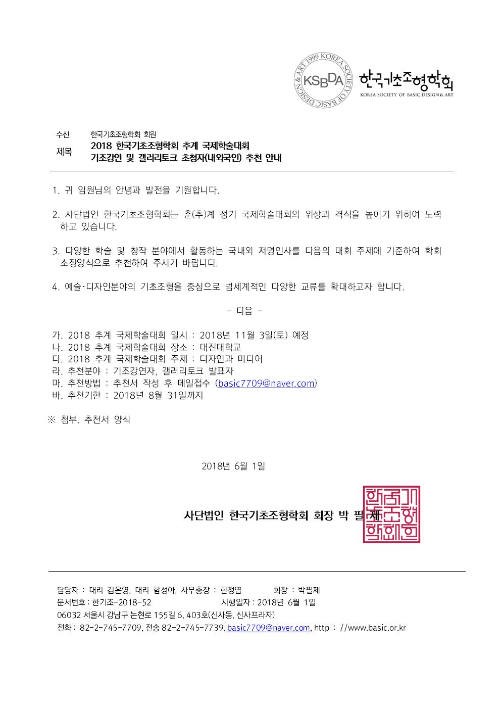 2018 한국기초조형학회 추계 국제학술대회 기조강연 및 갤러리토크 초청자 추천안내