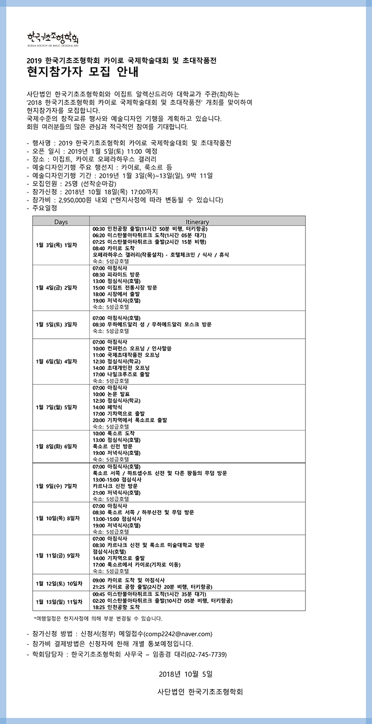 2019 한국기초조형학회 카이로 국제학술대회 및 초대작품전 현지참가자 모집 안내