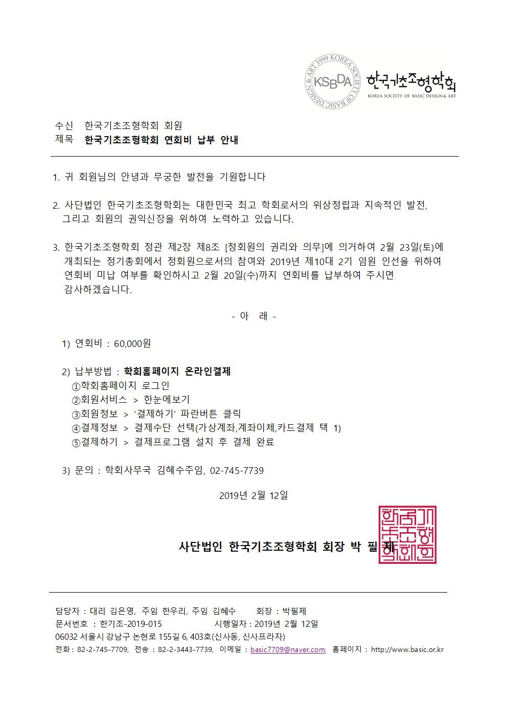 2019 한국기초조형학회 연회비 납부 안내
