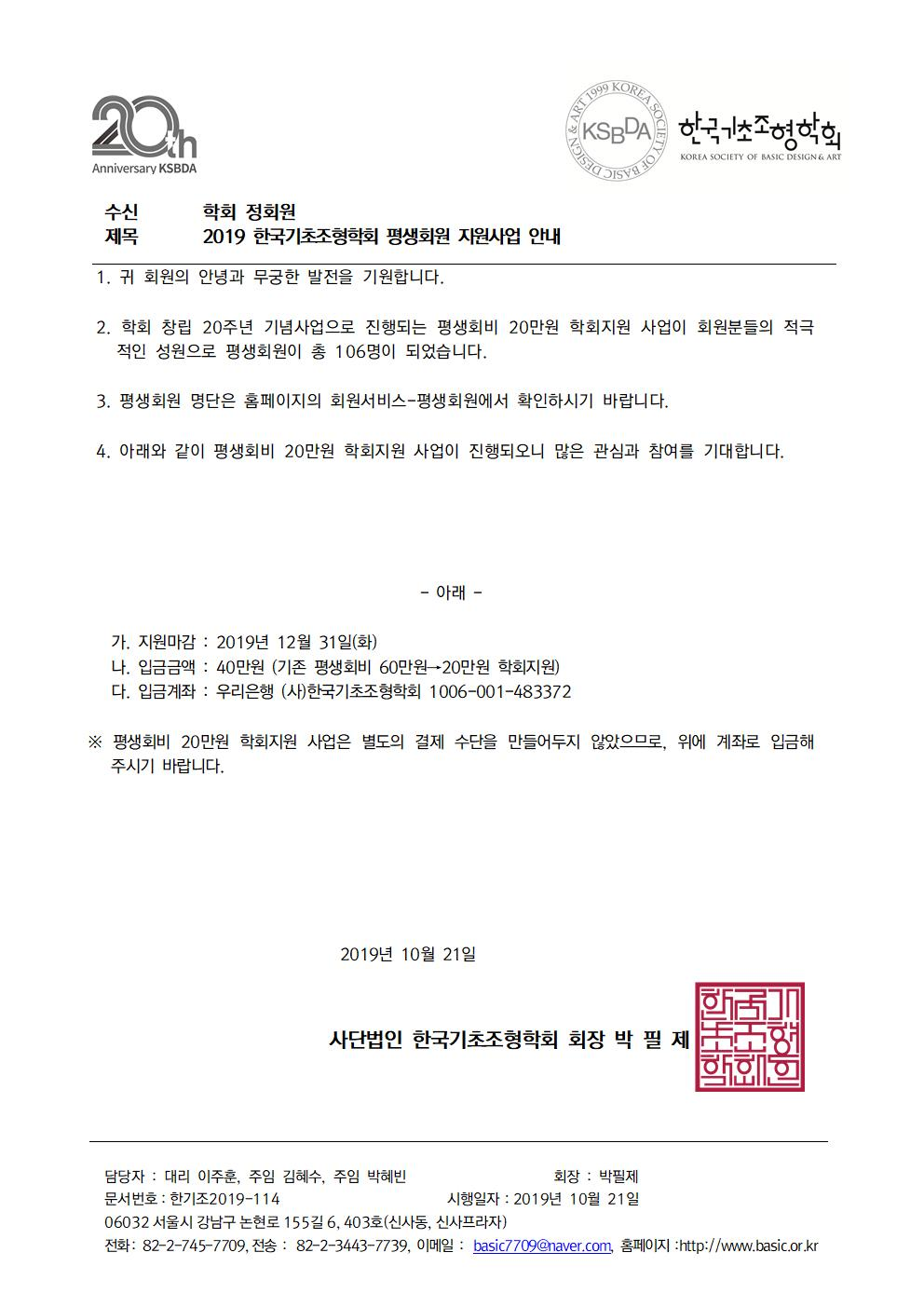 2019 한국기초조형학회 평생회원 지원사업 안내