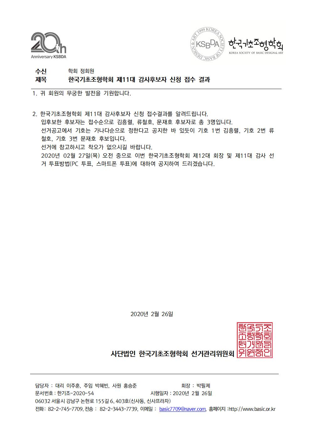 한국기초조형학회 제11대 감사후보자 신청 접수 결과