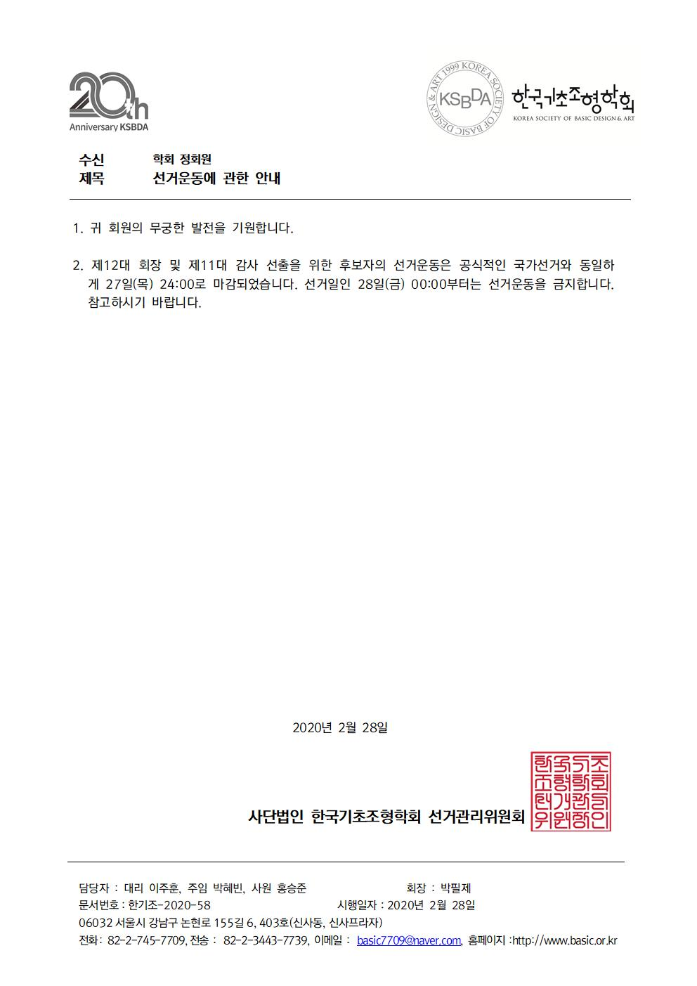 한국기초조형학회 제12대 학회 회장 및 제11대 감사선출 선거결과 참관 공고