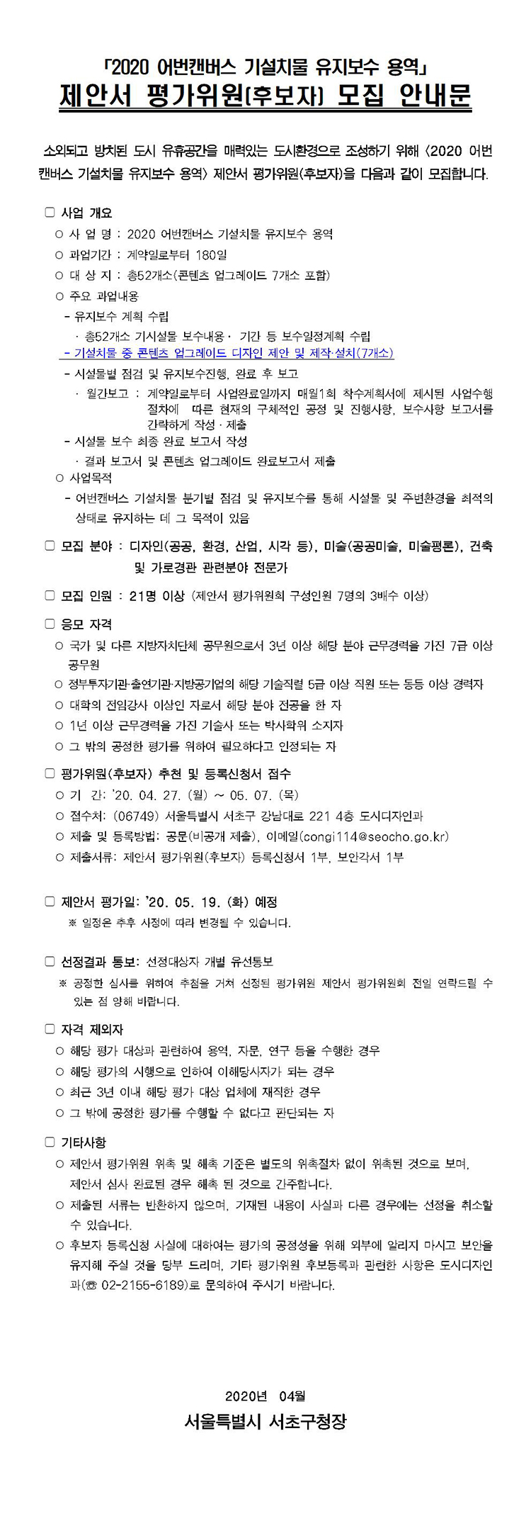 서초구청 제안서 평가위원 모집 안내문__2020 어번캔버스 신규제작설치