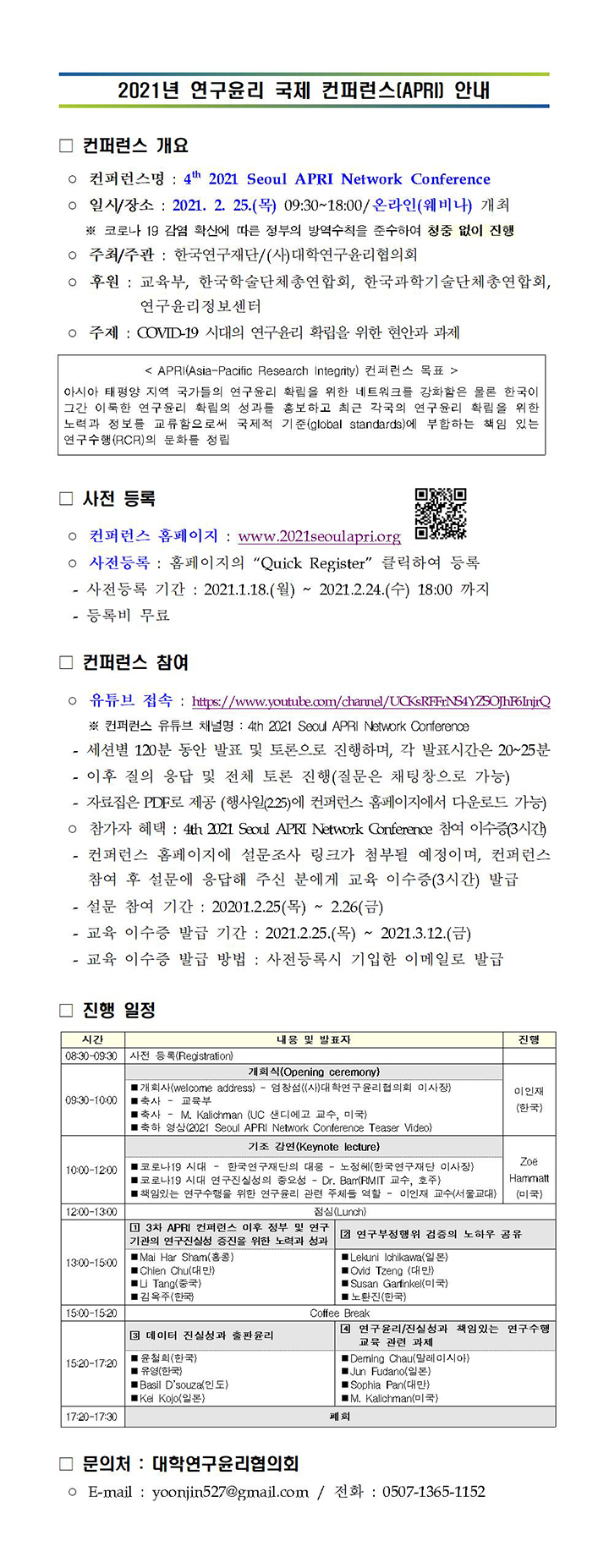 2021년 연구윤리 국제 컨퍼런스[APRI] 안내