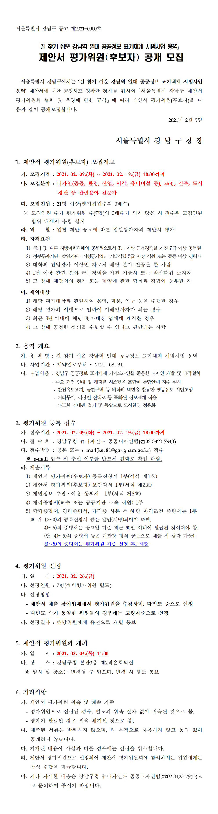 「2021년도 강남구 공공디자인 30地 설계용역」 제안서 평가위원(후보자) 모집 안내