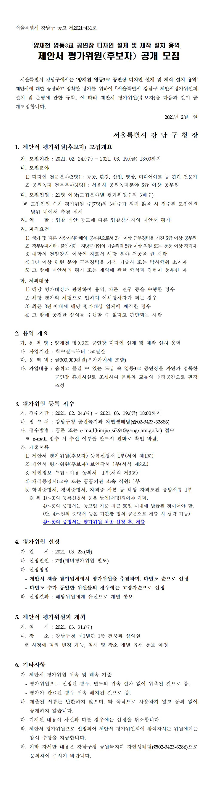 「양재천 영동3교 공연장 디자인 설계 및 제작 설치 용역」 제안서 평가위원(후보자) 공개 모집