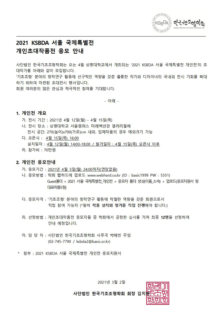 2021 KSBDA 서울 국제특별전 개인초대작품전 응모 안내