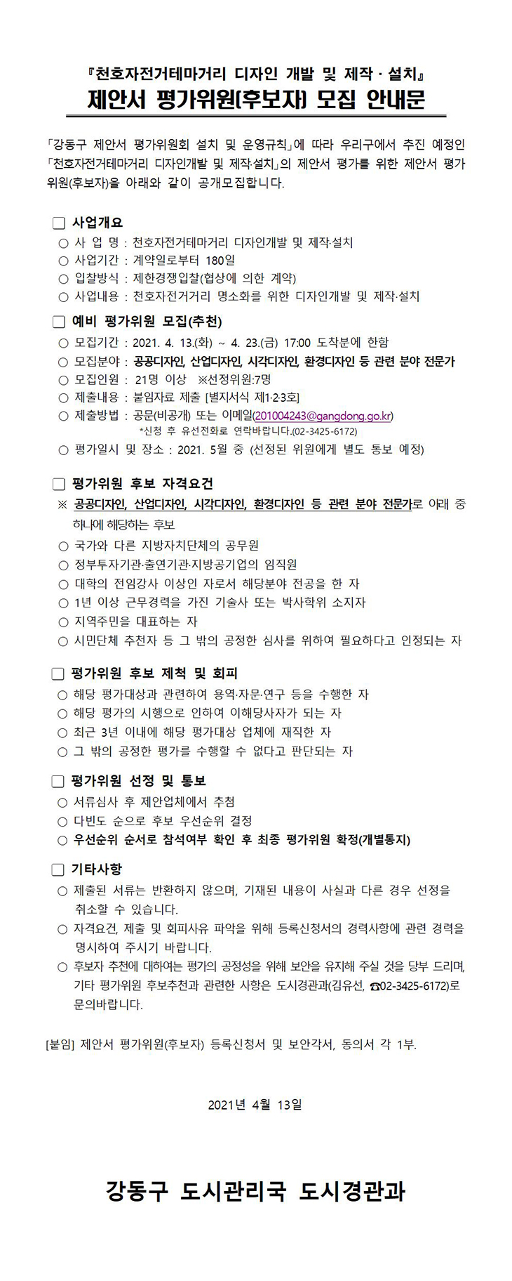 천호자전거테마거리 디자인 개발 및 제작ㆍ설치 제안서 평가위원(후보자) 모집 안내문