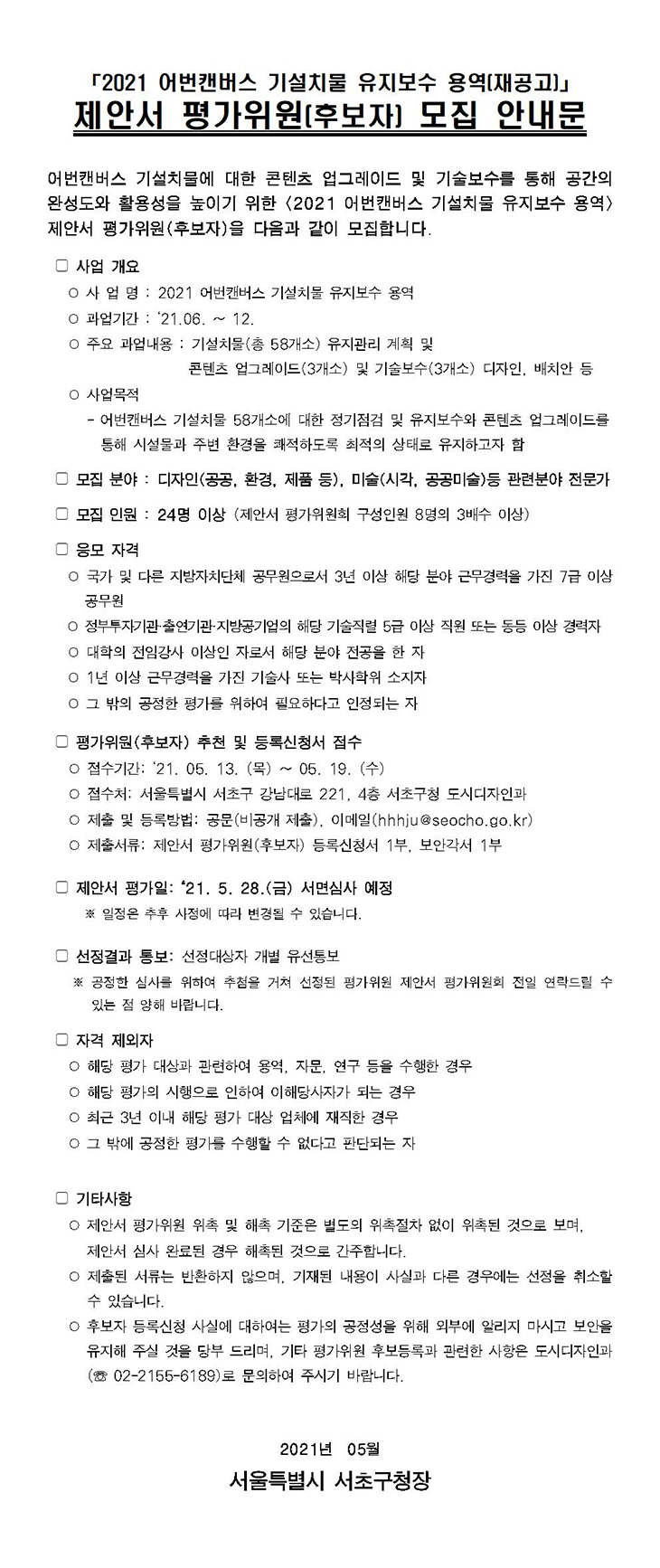 「2021 어번캔버스 기설치물 유지보수 용역(재공고)」 제안서 평가위원(후보자) 모집 안내문