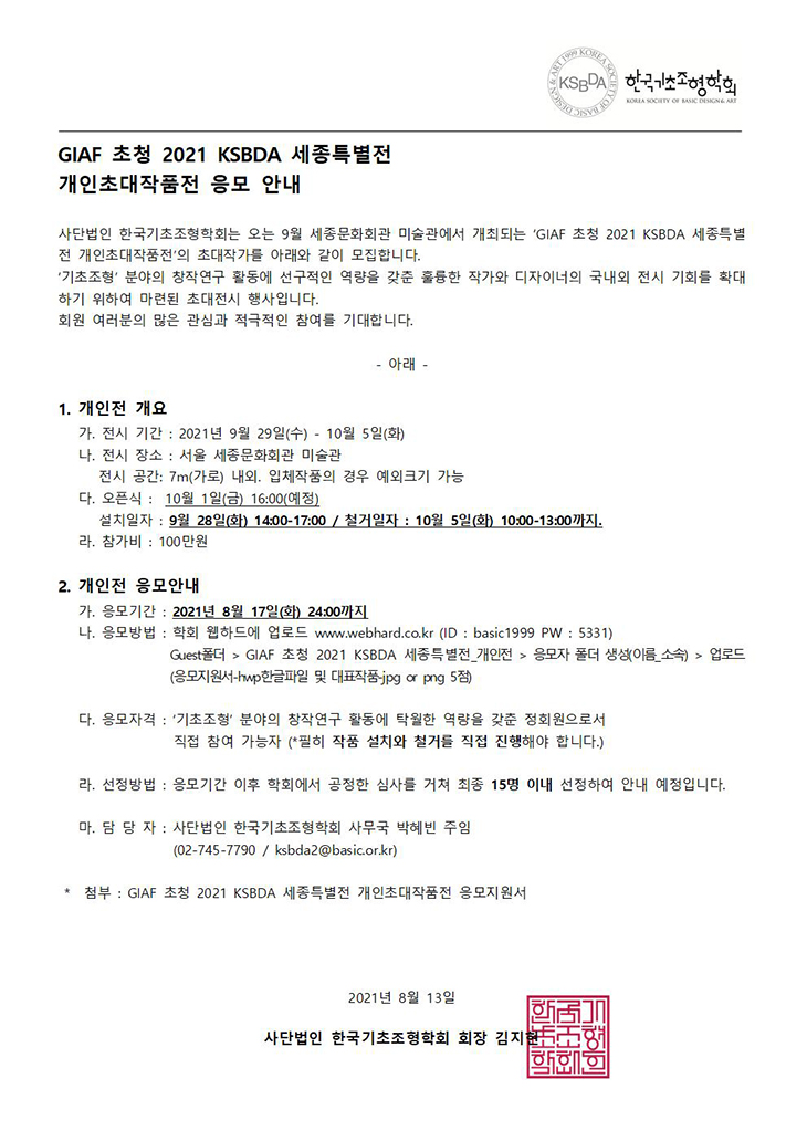 GIAF 초청 2021 KSBDA 세종특별전 개인초대작품전 응모 안내