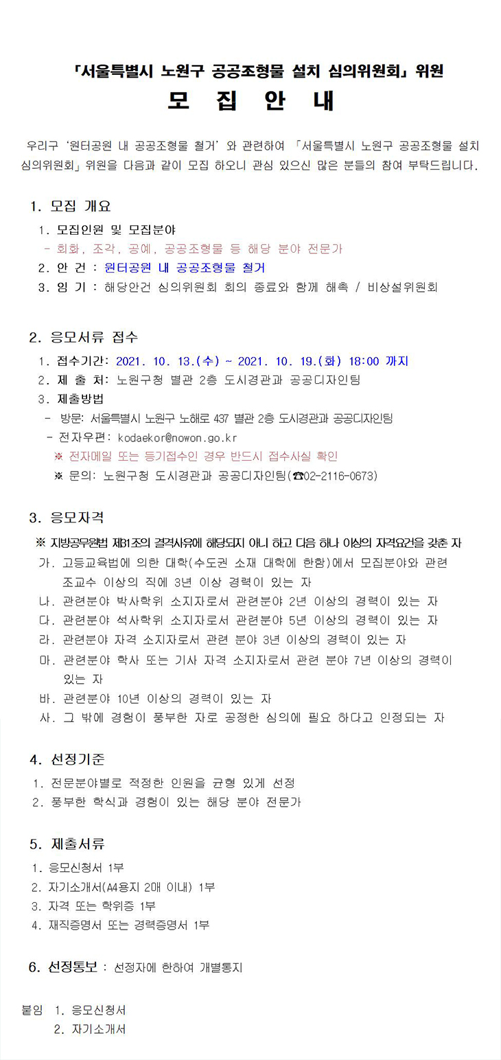 「서울특별시 노원구 공공조형물 설치 심의위원회」위원 모집안내