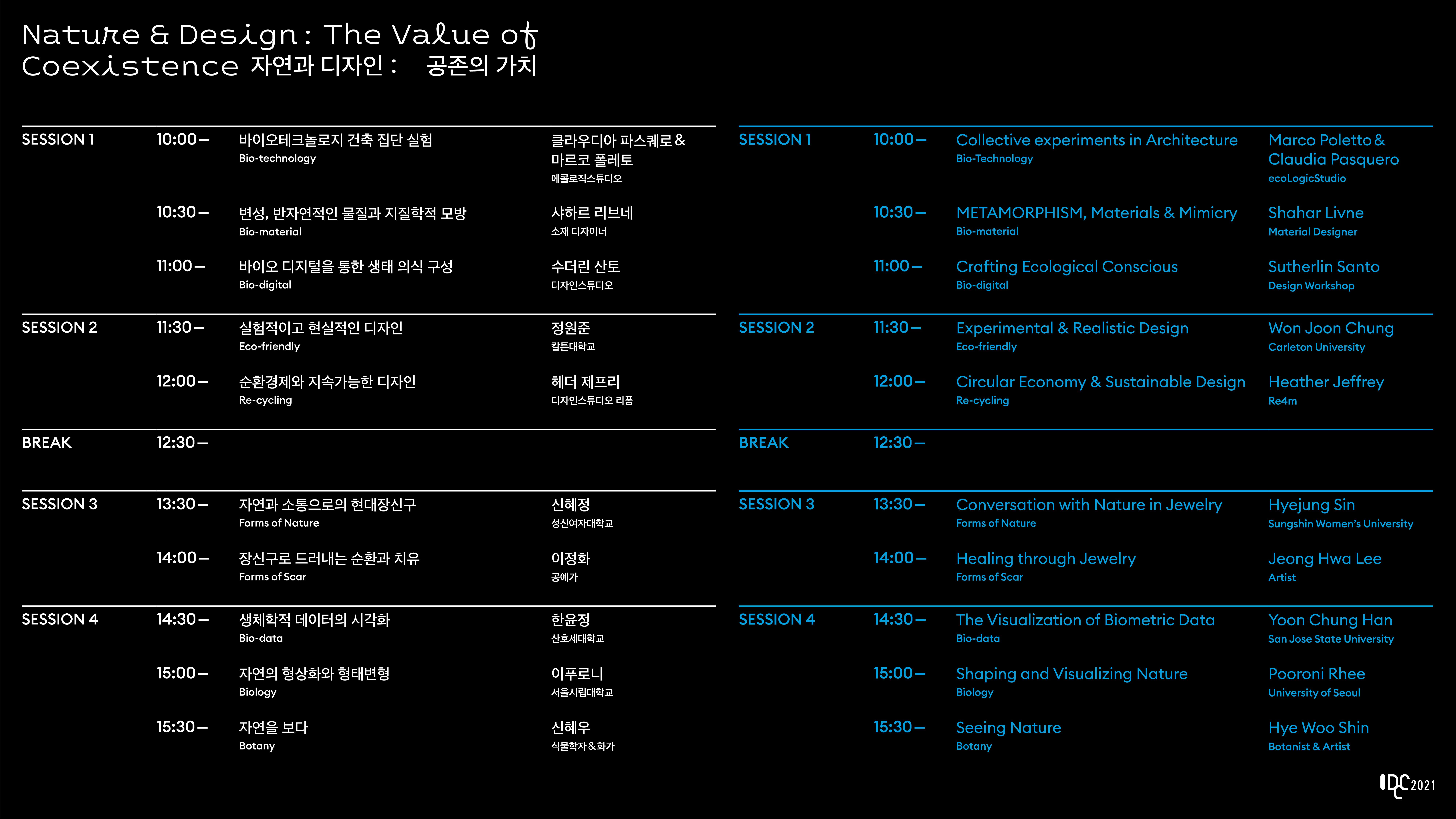 서울대학교 조형연구소가 주최하고, 서울대학교 디자인학부와 BK21 사회적 감수성을 실천하는 디자인 리더 양성 사업단이 주관하는 국제디자인컨퍼런스 IDCC(International Design Culture Conference)가 ‹자연과 디자인: 공존의 가치›라는 주제로 11월 5일 금요일 오전 10시부터 오후 4시까지 온라인으로 진행됩니다. 2021 IDCC는 자연과 인간의 공존을 화두로 자연에 대한 현시대 디자이너와 작가들의 다양한 관점들을 소개합니다. 유튜브 채널을 통해 11월 5일 오전 10시(KST, UTC+9)에 라이브스트리밍되는 강연은 사전 녹화로 한글 자막이 제공되며, 강연 진행과 동시에 유튜브 실시간 채팅으로 강연자와 Q&A도 진행됩니다.